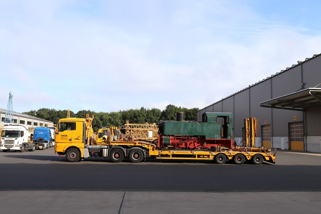 Mit Kettenzügen konnte die Lok dann auf provisorischem Gleis in die Richthalle gezogen werden. Mithilfe der Hebebockanlage wurde die Lok dann auf regelspurige Hilfsdrehgestelle verladen und auf diesen aus der Halle gefahren. Die Firma Hack Schwerlastservice aus Windhagen übernahm wie gewohnt den Transport in die neue Heimat. Am 1. August 2025 wurde die Lok in Köln aufgeladen und bedingt durch eine kurzfriste Autobahnsperrung auf der A4 zunächst auf das Firmengelände in Windhagen verbracht.