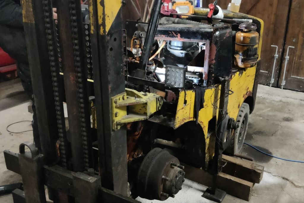 Doch die vielen Jahre des harten Einsatzes sind auch an diesem Fahrzeug nicht spurlos vorüber gegangen und so wurde der Gabelstapler teilweise zerlegt, um ihn gründlich instand zusetzen. Neben einer komplett neuen Elektrik, werden auch die Bremsen und der Kühlwasserkreislauf umfangreich überarbeitet.