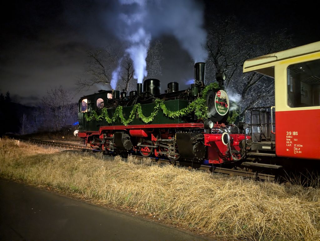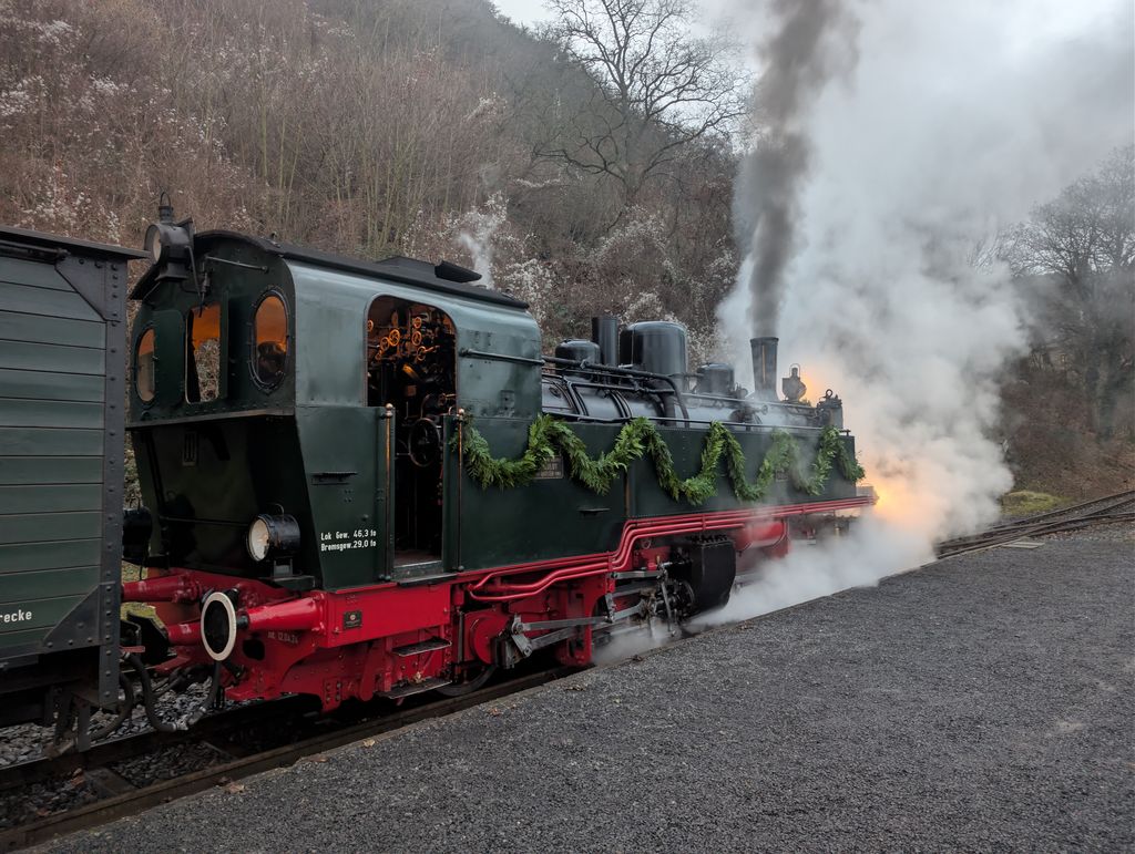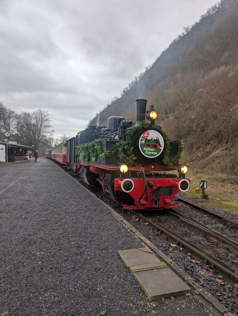 Von daher verwundert es nicht, dass uns der IBS zur Sonderfahrt anlässlich des 125 jährigen Jubiläums der Streckeneröffnung am 14. Januar 2026 einlud. Gezogen wurde der Zug selbstverständlich von der letzten erhaltenen Dampflok der Brohltalbahn, der Malletlok 11sm, die viele Jahre gemeinsam mit unserer Dampflok 53 im DGEG Museum in Viernheim ausgestellt war. Seit 1991 ist sie zurück in Ihrer Heimat und bespannt nach einer umfangreichen Aufarbeitung seit 2015 wieder an ausgewählten Tagen den Vulkan-Express.